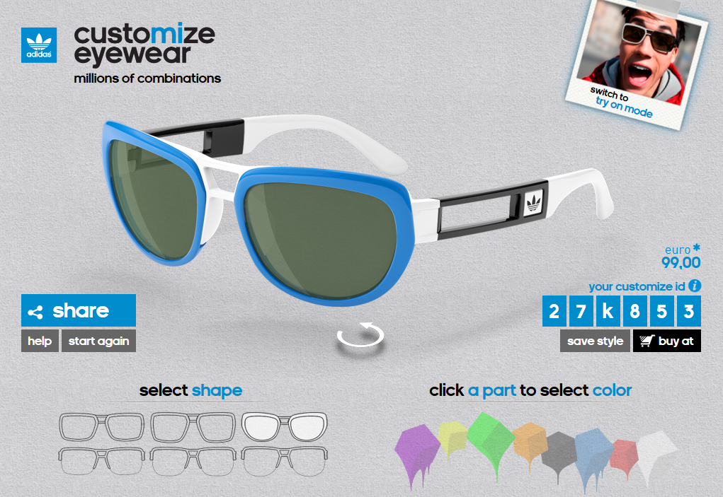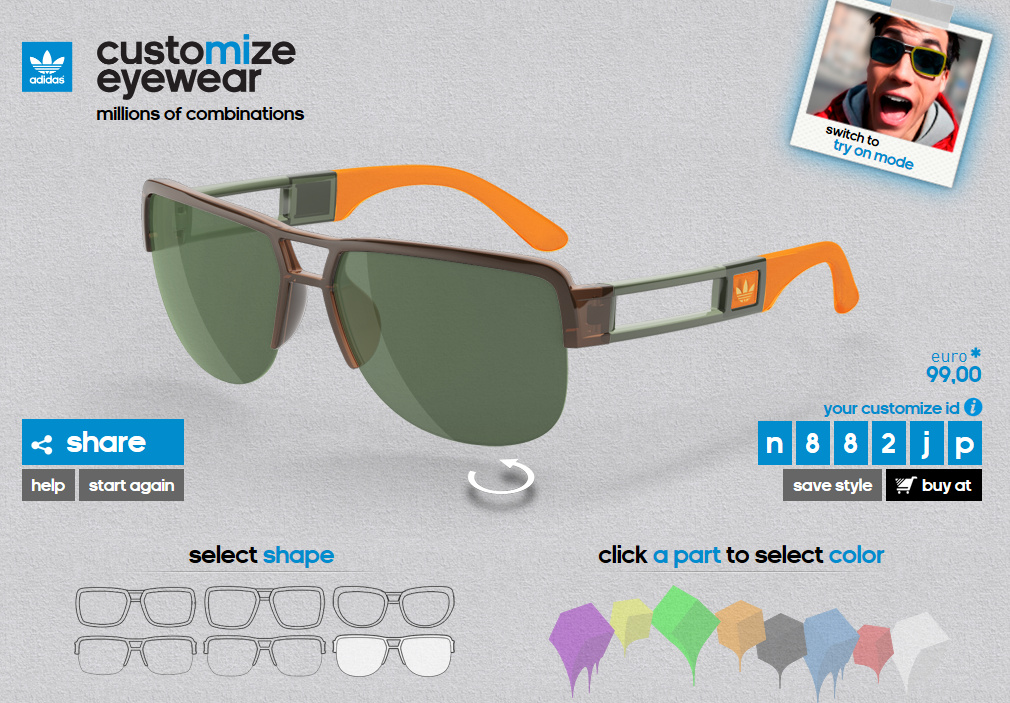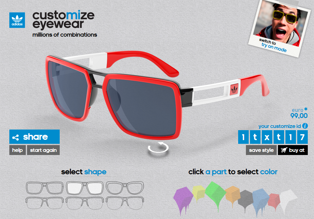Adidas hat ein neues Modell herausgegeben. Diese Brille kann jeder selbst so designen wie er will. Und alle Modelle sind kombinierbar. Man kann die Farben der Fassung, Gläser, Bügel und Bügelenden so zusammenstellen das jede Brille ein Unikat wird. Es gibt 1.030.656 verschiedene Kombinationen.